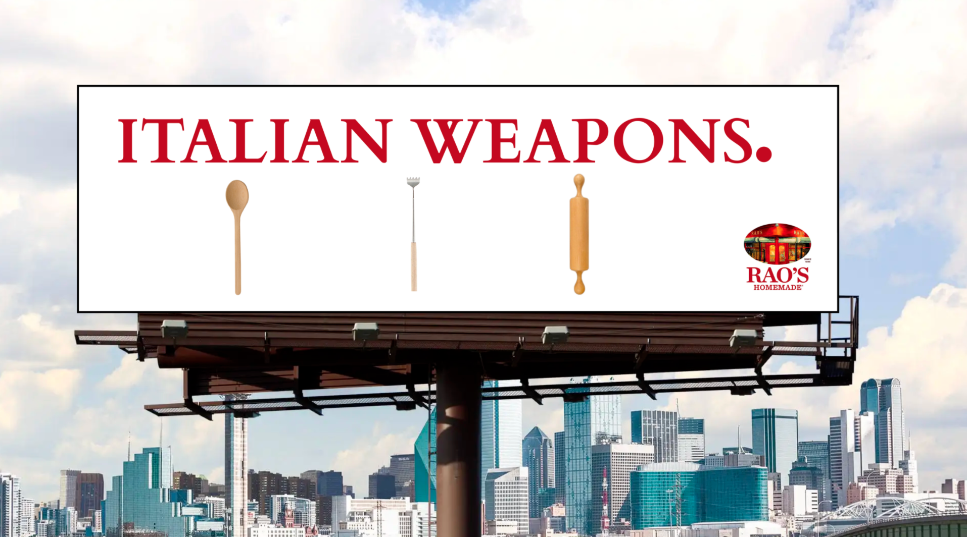 This billboard plays with the idea of Italians’ love for food and that their weapon of choice would come from the kitchen. While reading the billboard from their car or home, consumers will learn that there is no need to argue because Rao’s makes the best marinara sauce.
