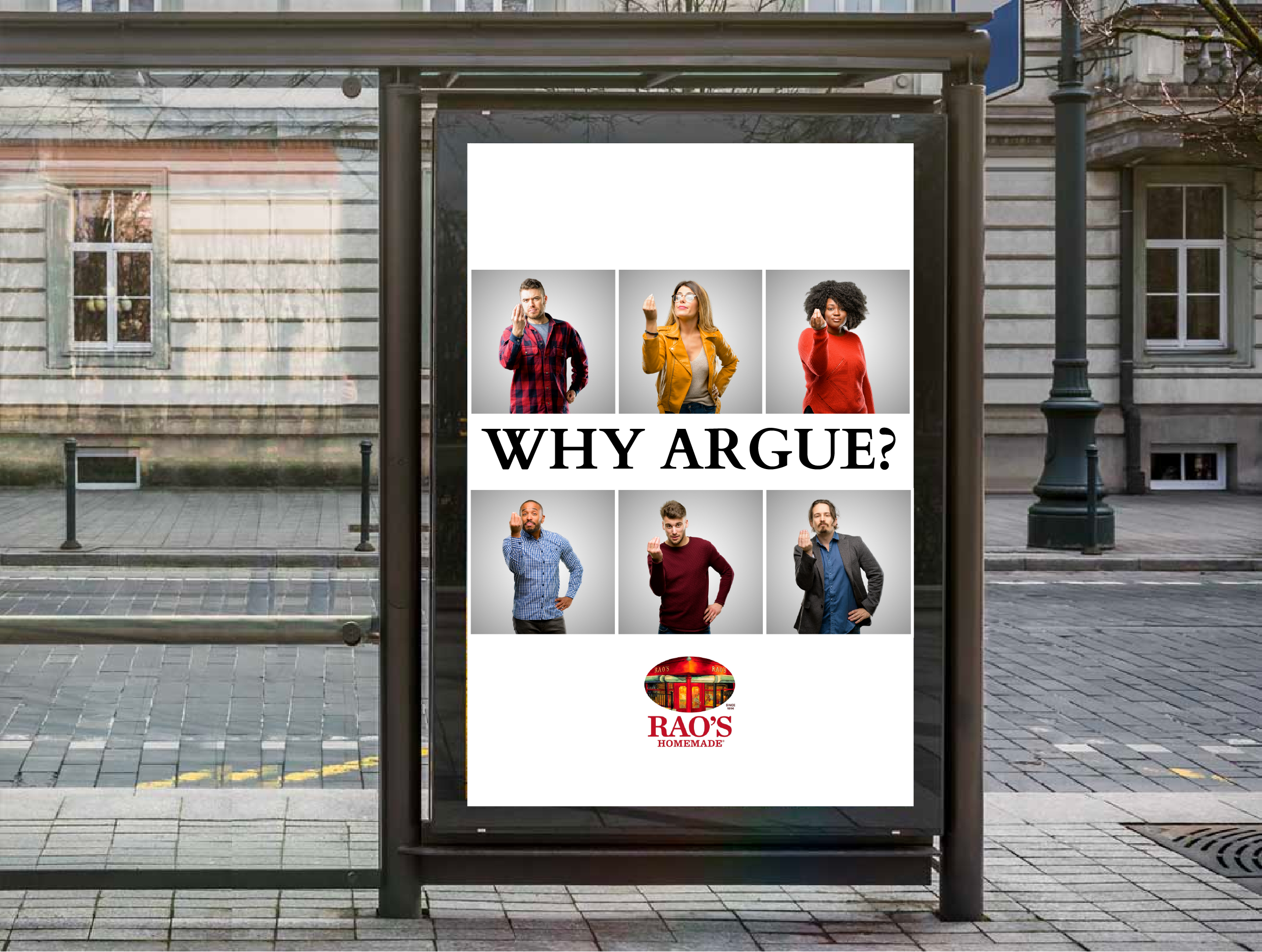 Many students ride the campus buses and will easily be able to see this poster displayed on a bus shelter. They will learn there is no point in arguing about the best marinara sauce if all Italians agree that it’s Rao’s.