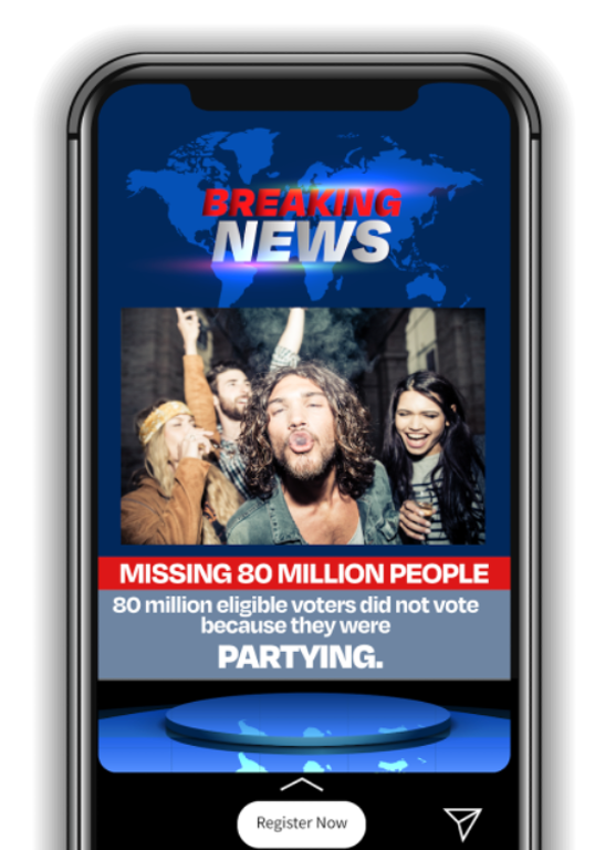 Using the “Find My iPhone” display, this ad aims to locate the 80 million eligible American voters that are “missing.” This feature is used by many college students, making it easier to recognize and understand.
